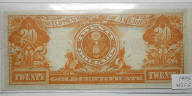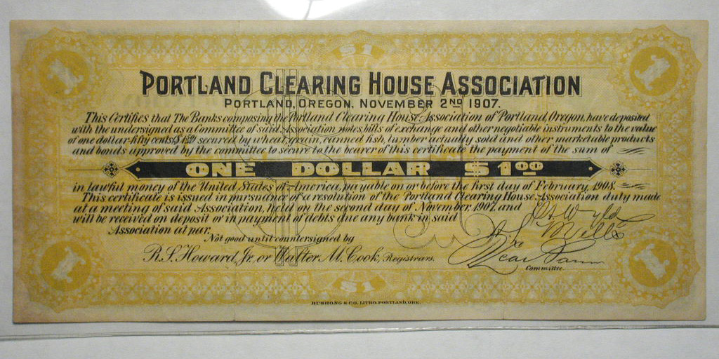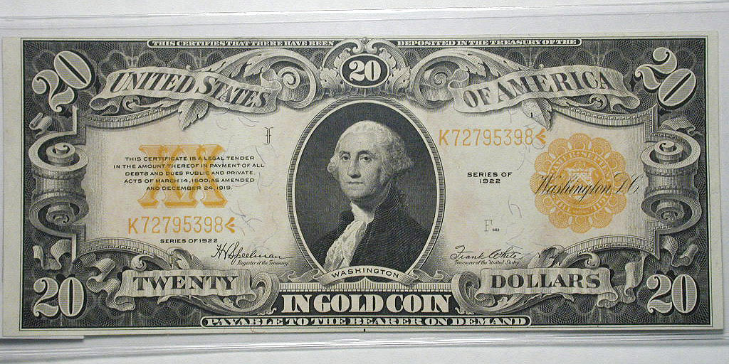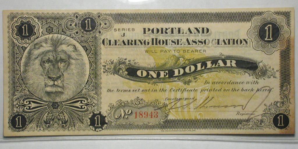 Top: 1907 Portland Clearing House Assoc. $1 note with lion. Bottom: 1922 US $20 gold certificate.