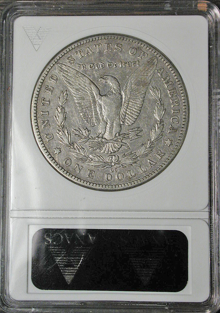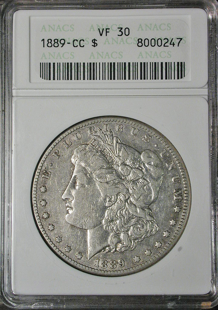 Right: 1889-CC Morgan Dollar, ANACS VF-30; no "Net" grade even though lightly cleaned.