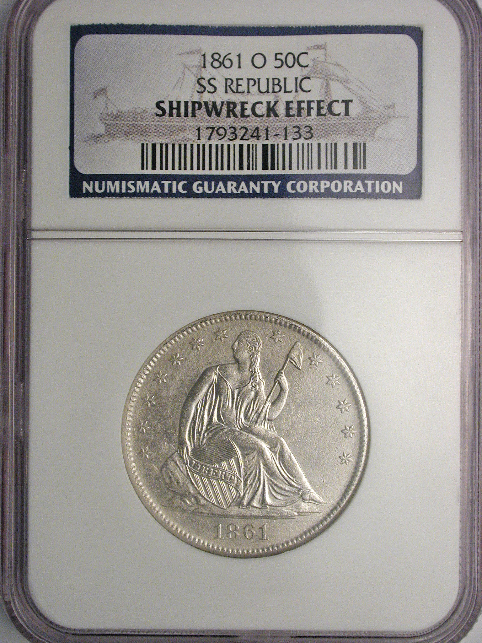 Left: 1807 Quarter, PCGS G06. Right: 1861-O Half Dollar, SS Republic shipwreck effect.