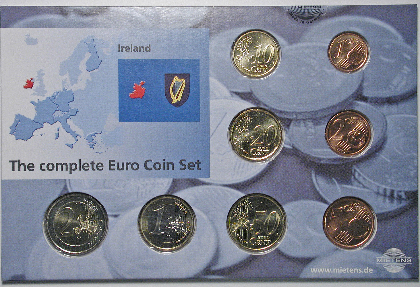 Left: "Proof" set of German porcelain notgeld. Center: Euro coin set from Ireland. Right: Thai coin set.