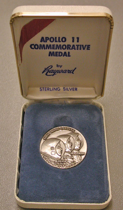 Center: Apollo 11 sterling silver commemorative medal by Hayward.