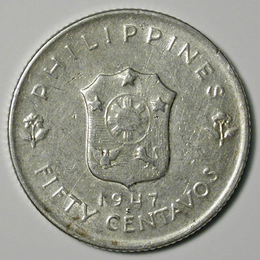 Right: 1947-S Philippines 50 centavos coin, during period of US control.