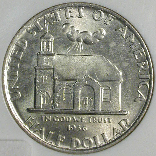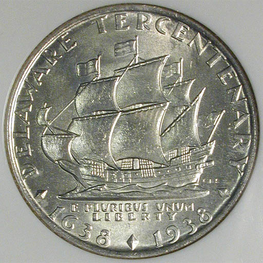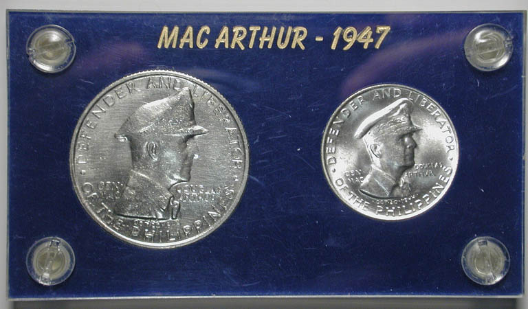 Top: 1936 Delaware Tercentenary commemorative half, NGC MS-65. Bottom: Set of 1947 Philippine coins depicting General Douglas MacArthur.