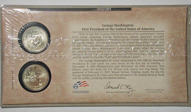Right: 2007 George Washington presidential dollar coin cover issued by U.S. Mint.