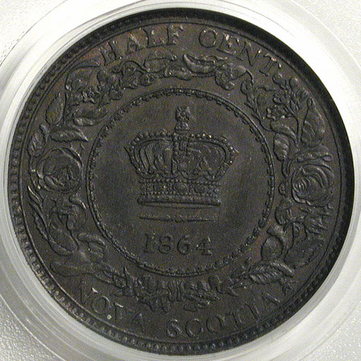Left: 1864 Nova Scotia half cent, PCGS MS-63BN (Brown). Right: Armenian coin commemorating 1996 XXXII Chess Olympiad.