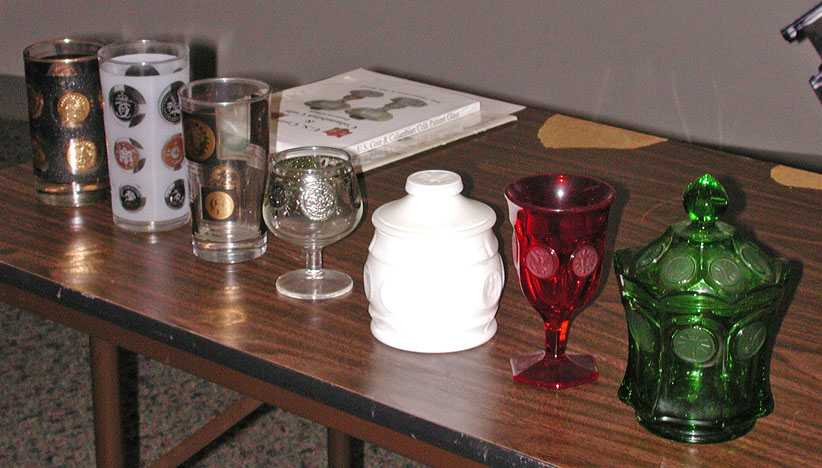 Left: Dick Cowley giving talk about coin glass. Center: Samples of coin glass. Right: A coin candle!