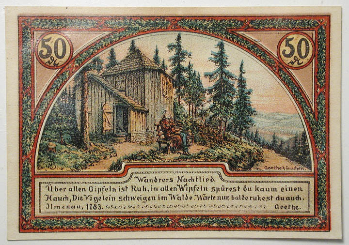 Top: 1921 50 pfennig German notgeld depicting Goethe. Bottom: Philippines One Peso banknote, Victory Series No. 66, approved 1922.