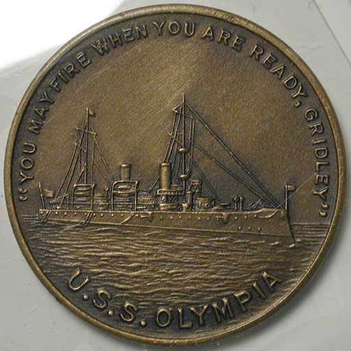 Left: University of Florida Gators Air Force ROTC "coin." Right: U.S.S. Olympia relic medal made from propeller of ship; Battle of Manila Bay, 1898.
