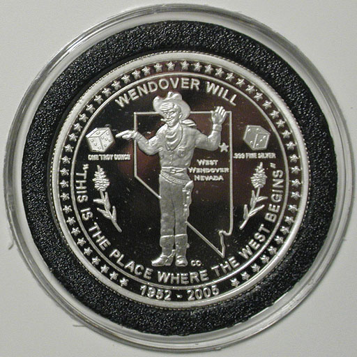 Left: 2005 "Wendover Will" commemorative silver piece from West Wendover, Nevada. Right: 2007 Reno-Tahoe International Airport $10 gaming token featuring the cui-ui (kwee-wee).