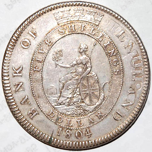 Left: Unusual "Five Shilling Dollar" Bank of England token dated 1804.