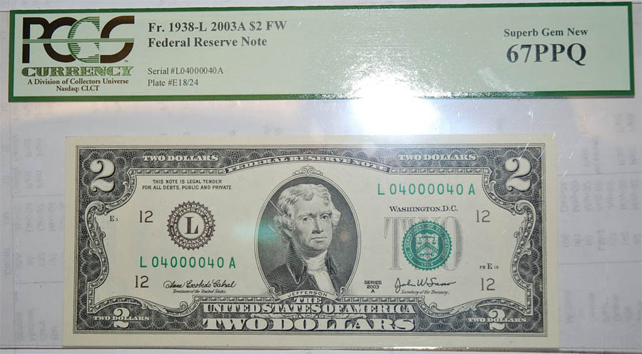 Right: Series 2003A $2 Federal Reserve Note certified 67PPQ by PCGS.