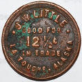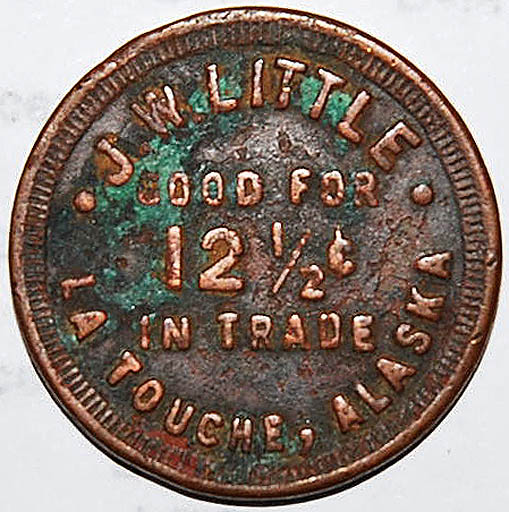 Right: J.W. Little, La Touche, Alaska 12 1/2 cent trade token made of "native copper."