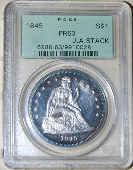 Left: 1777 Six Shillings colonial currency, printed in Philadelphia by John Dunlap. Right: 1845 Liberty Seated Dollar, PCGS PR63, J.A. Stack collection.