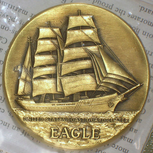 Left: United States Coast Guard Eagle commemorative medal. Right: Hexagonal one ounce "silver trade unit" featuring eagle and Liberty Bell.