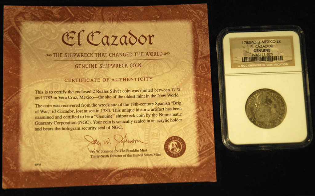Right: 1782-Mo 2 reales coin from the shipwreck of the El Cazador,