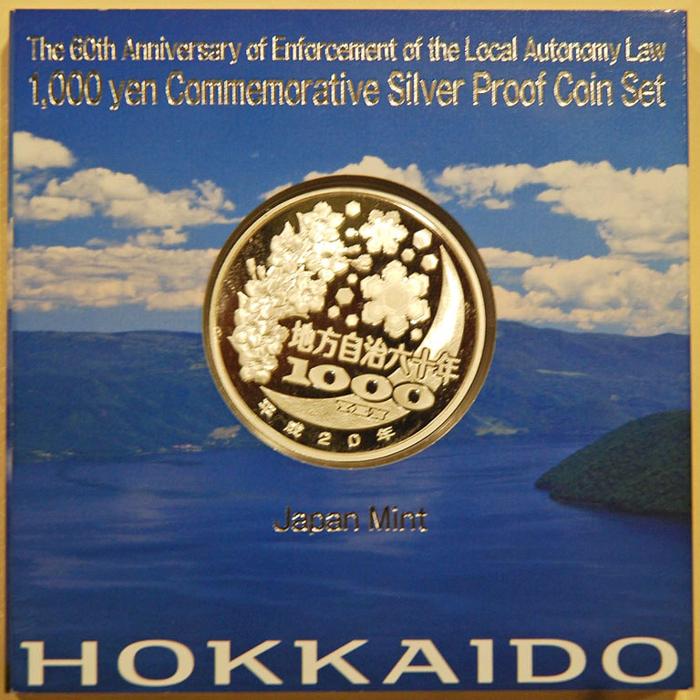 Right: Hokkaido, Japan 60th anniversary of local autonomy law commemorative 1,000 yen coin.