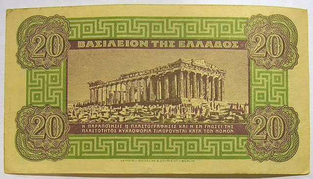 Upper: 1940 Greek 20 drachma banknote (Parthenon on back).
