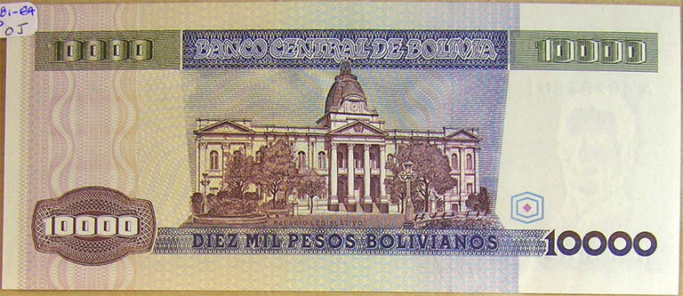 Top: Bolivia 10,000 pesos (Pesos Bolivianos) banknote.