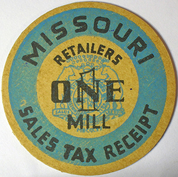 Missouri cardboard one-mill sales tax receipt, counterstamped on reverse to honor Jerry Bates.