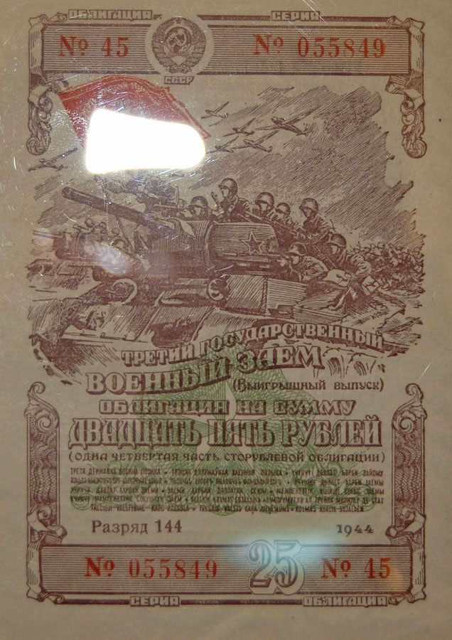 Left: 1942 and 1944 Soviet Union war bonds or similar items.