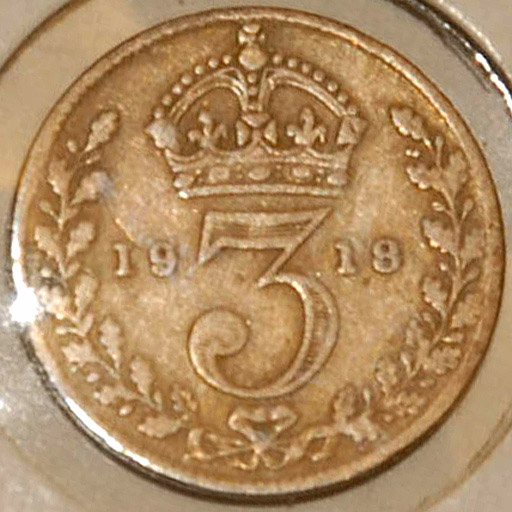 Left: 1918 United Kingdom King George V 3 pence, KM# 813.