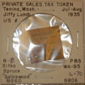 Left (1): 1935 Tenino, WA private sales tax token made of wood.