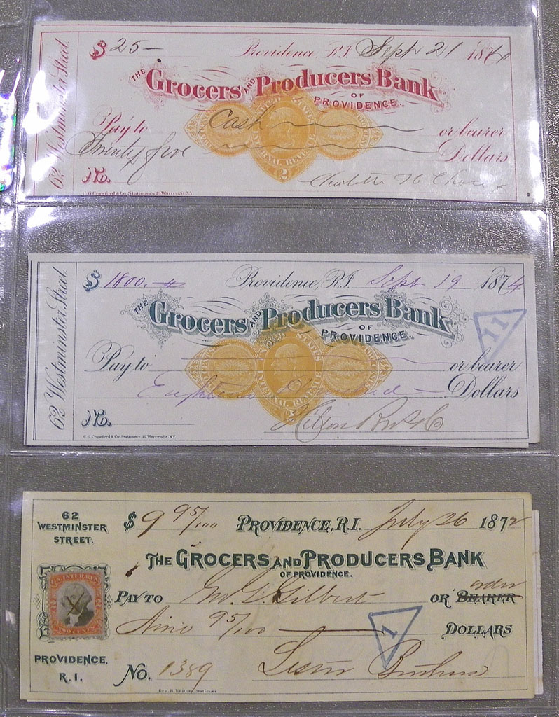 Left: 1870s checks from The Grocers and Producers Bank of Providence, Rhode Island.