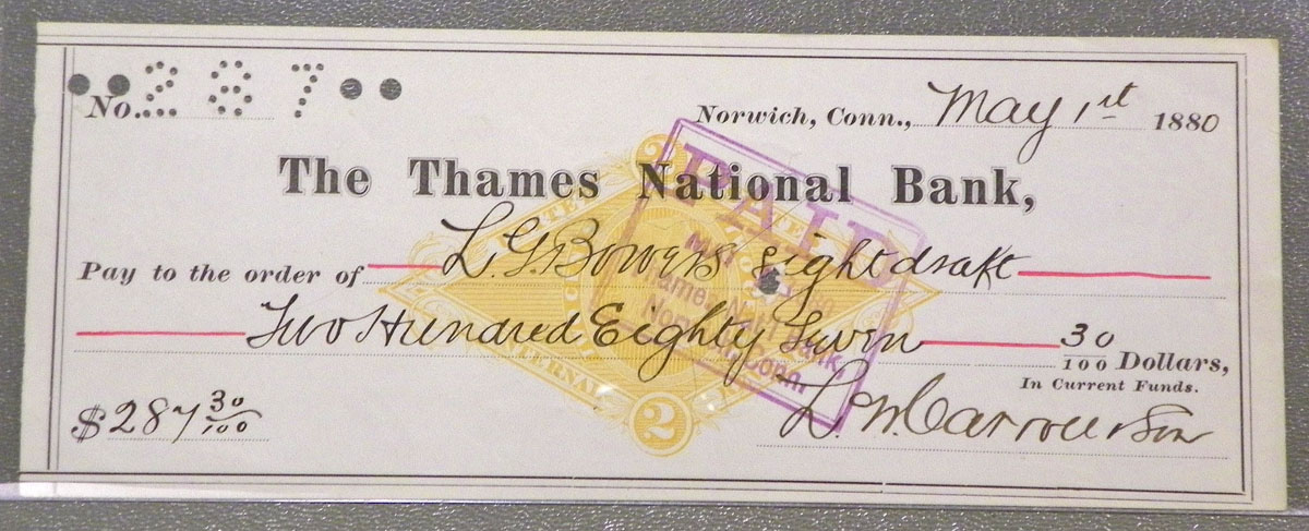 Center: 1880 The Thames National Bank (Norwich, Conn.) check.