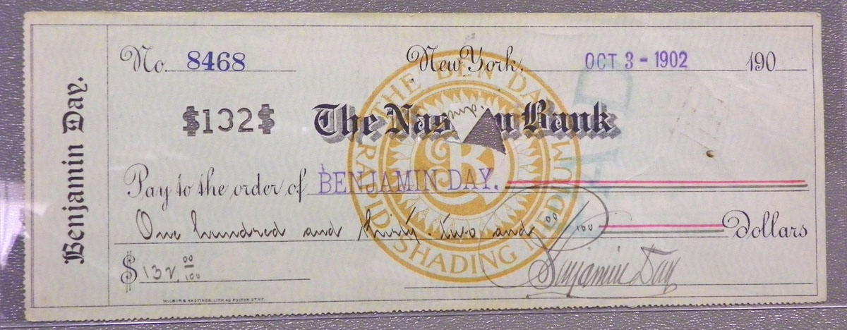 Right: 1902 "Ben Day" check from The Nassau (?) Bank, New York.
