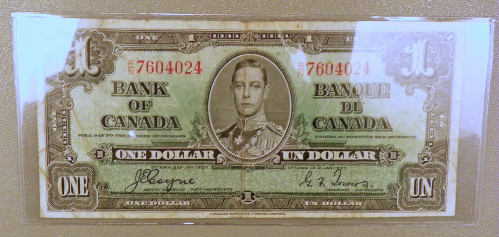 Left Center: Henfrey's Guide to English Coins. Center: 1937 Bank of Canada $1 banknote.