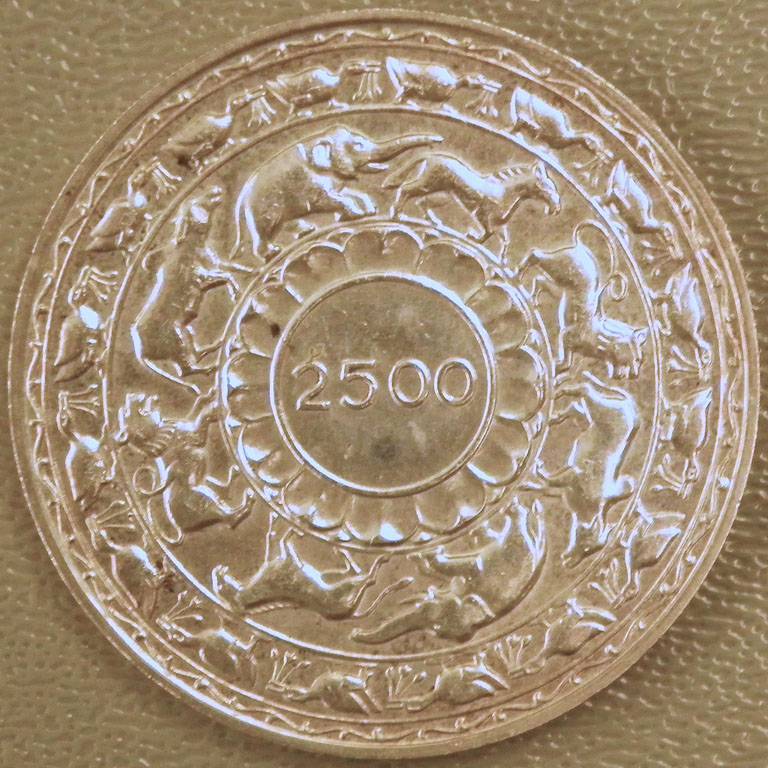 Center: 1957 Ceylon 5 rupees commemorative coin, 2,500 years of Buddhism.