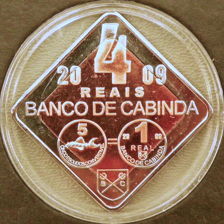 Right: 2009 Banco de Cabinda 4 reais coin.
