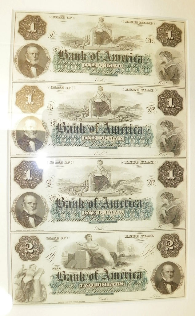 Right: State of Rhode Island / Bank of America $1 and $2 banknotes.