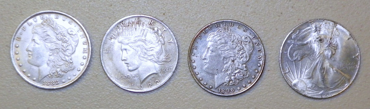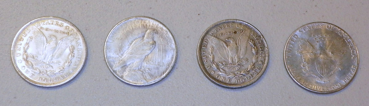 Bottom: Apparently fake U.S. silver dollars, including 1906-dated silver eagle!