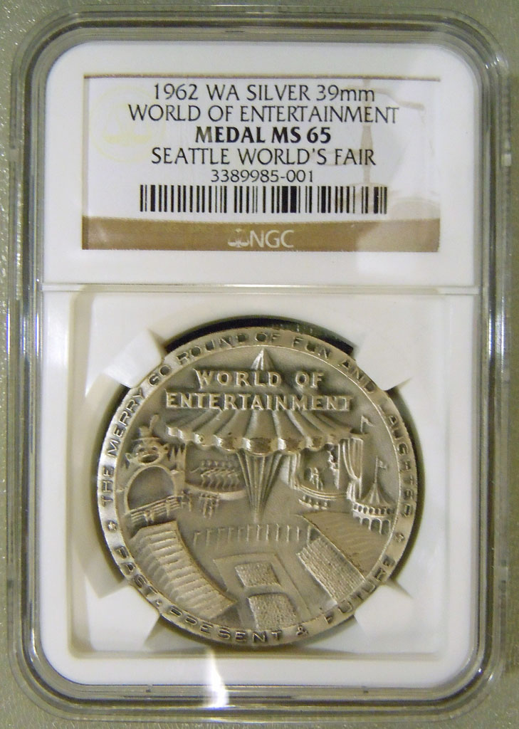 Center: 1962 Seattle World's Fair "World of Entertainment" medal, NGC MS 65.