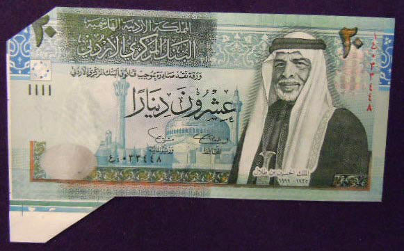 Right: 2002 Jordan 20 Dinars banknote with cutting error.