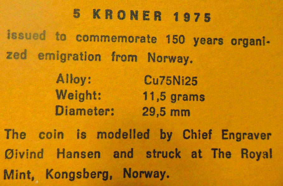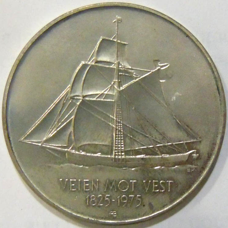 1975 Norwegian 5 Kroner coin commemorating 150 years of organized emigration from Norway.