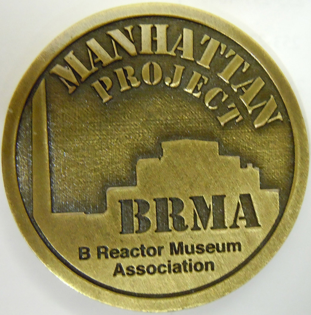 Left: Series 692 5 cents Military Payment Certificate. Right: B Reactor Museum Association (Hanford, Washington) medal.