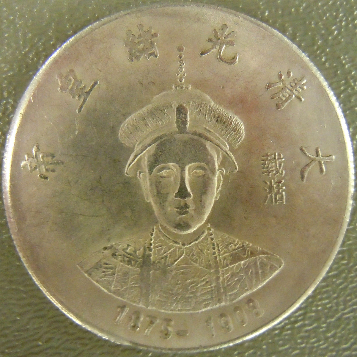Top row: Emperors of China commemorative medals and ? (at right). Bottom row: Chinese oval-shaped cash coin (replica?).