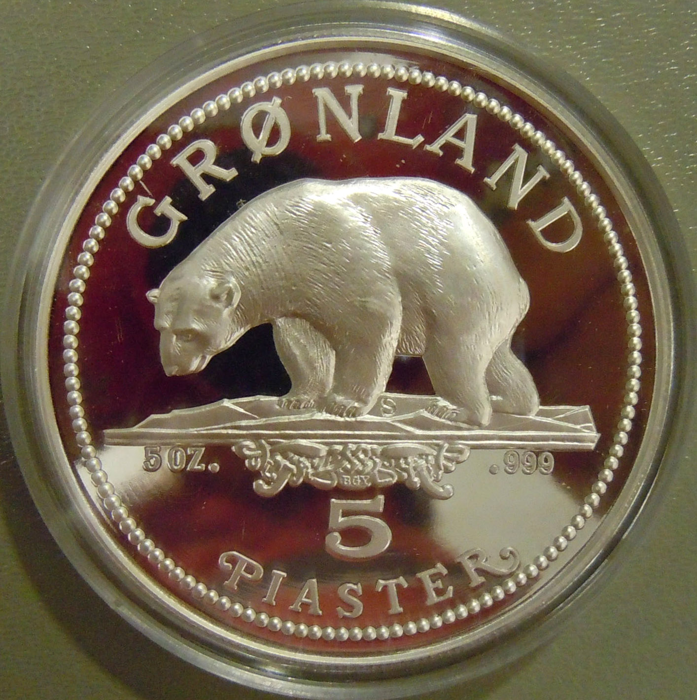 Right: 1987 Greenland 5 piaster 5-ounce silver coin depicting a polar bear.