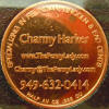 Right: Charmy Harker / "The Penny Lady" copper advertising token.