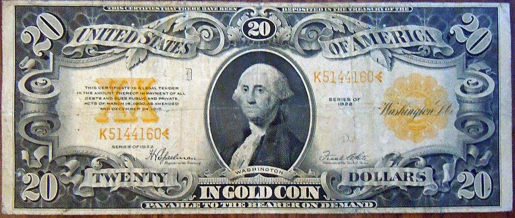 Top: 1922 $20 U.S. Gold Certificate. Bottom: 2009 $1 bill with palindrome serial number; also with six sevens!