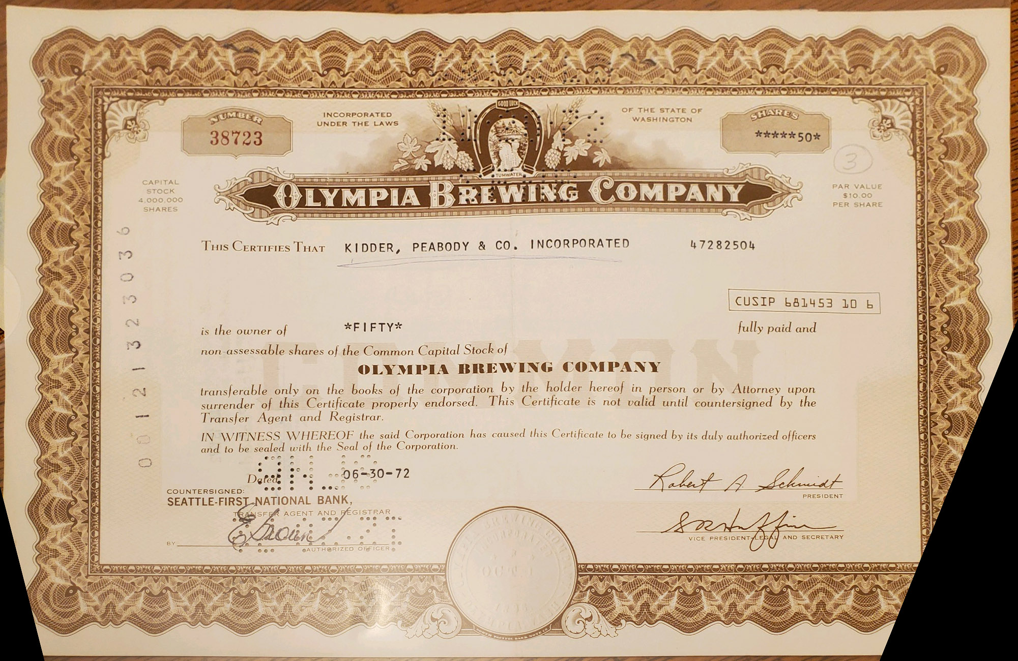 Center: Olympia Brewing Company stock certificate, dated 06-30-72.
